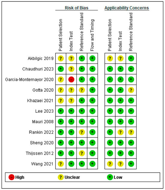 Regarding the index test, all studies exhibited a low risk of bias, except for Akbilgic 2019, Chaudhuri 2023, Gotta 2020, and Khazaei 2021 [29,31,37,38], which showed unclear risk of bias; Garcia-Montemayor 2020 showed high risk of bias [10].