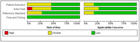 - Whiting, P.F.; Rutjes, A.W.S.; Westwood, M.E.; Mallett, S.; Deeks, J.J.; Reitsma, J.B.; Leeflang, M.M.; Sterne, J.A.; Bossuyt, P.M.; QUADAS-2 Group. Quadas-2: A revised tool for the quality assessment of diagnostic accuracy studies. Ann. Intern. Med. 2011, 155, 529–536. [Google Scholar] [CrossRef] [PubMed]