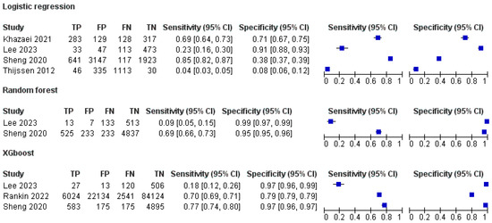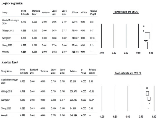 Detailed estimates for each study assessing Random Forest and Logistic Regression, along with their 95% CI, are presented in Figure 7.