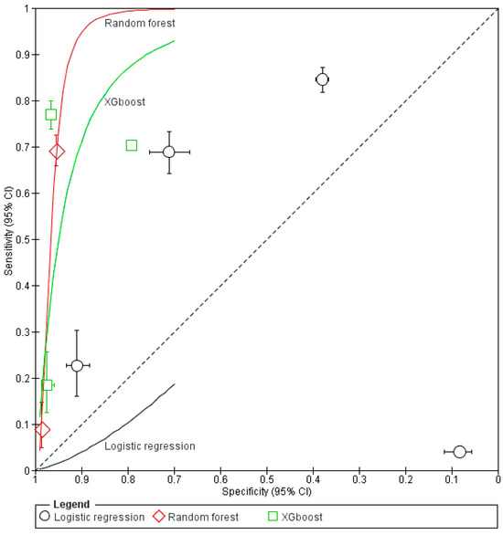 Since Logistic Regression, XGBoost, and Forest Plot were the most frequently assessed models within the included studies, we generated a Forest Plot for the sensitivity and specificity of the models, as shown in Figure 4. In addition, an SROC plot was generated for the three models, along with their 95% CI, as shown in Figure 5.