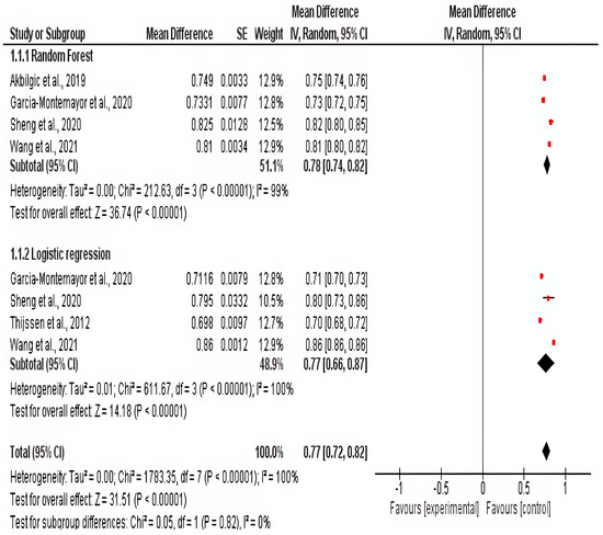 We performed the statistical analysis using the Review Manager (Revman) software version 5.4.1. To pool the results of the meta-analysis, we used mean difference (MD) with a 95% confidence interval (CI). Significance was detected at a p value less than 0.05. A random-effects model was chosen due to the anticipated clinical and methodological diversity across studies, including variations in patient populations, ML models used, features included, and study designs. Statistical heterogeneity was assessed using the Chi-square test at p < 0.1. Subgroup analysis based on the machine learning model tested, along with leave-one-out sensitivity analysis, was planned to explore potential sources of heterogeneity.