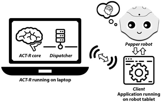 Our system consists of the humanoid social robot Pepper with a software application that connects to OpenAI’s GPT-4o model via an API, and it communicates over a wireless TCP/IP network with the current version of the ACT-R 7 cognitive architecture software running on a remote computer. ACT-R offers the technical possibility of integrating a cognitive model with bidirectional communication into an application of choice. To establish a remote connection from the robot application to ACT-R, we used its remote interface—the dispatcher [25]. Figure 1 shows the setup of the bidirectional connection between the dispatcher, which acts as a kind of server, and the client application of the robot.