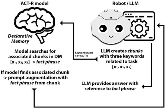 The cognitive architecture of ACT-R comprises a declarative and a procedural memory, whereby the declarative memory supports lexical knowledge by encoding, storing, and retrieving semantic knowledge, as in humans, while the procedural memory enables the learning of habits and skills [19,20,21,22]. Using the ACT-R chunk and memory system to store, retrieve, and process facts and impressions of a real-world scenario and utilizing knowledge from the procedural memory of the cognitive model allows an LLM to incorporate these facts into utterances, paving the way for a more reliable, evidence-based, and human-like application of LLMs.