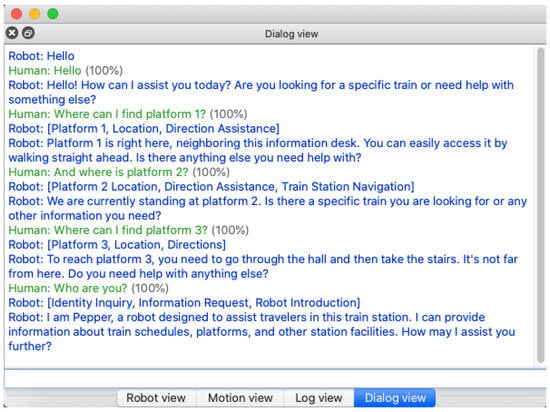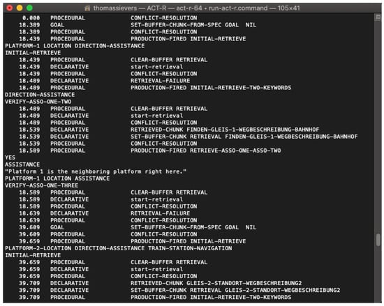 The LLM therefore used the fact correctly, albeit in its own wording and with some embellishment from the scenario conditions. Details of a dialog run can be seen in Figure 4, showing an output in the graphical tool of the QiSDK robot emulator [50]. The output of the keywords in square brackets was only for testing purposes and would not be spoken by the robot in a production application. Part of a corresponding trace output of the running ACT-R model is shown in Figure 5.