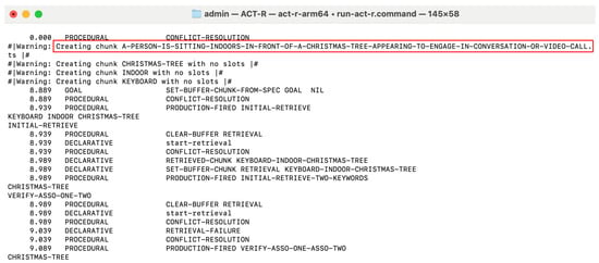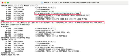 Figure 6 shows the generation of individual chunks from the keywords ‘keyboard’, ‘indoor’, and ‘christmas tree’, and it presents in a frame the phrase ‘A person is sitting indoors in front of a christmas tree appearing to engage in conversation or video call’, supplied by the LLM in the running ACT-R model. These chunks were transferred to the declarative memory of the cognitive model, not only separately, but also as a composite chunk consisting of keywords and phrase. To be able to save keywords and phrases as chunks, spaces had to be replaced by a ‘-’. The procedure was reversed when the phrase was used for prompt augmentation. A retrieval of a recollection by the ACT-R model is shown in Figure 7 in framed areas. The model searches the stored memory chunks using the supplied keywords to find a matching recollection, the content of which is passed from the ‘phrase’ slot to the robot application for use in prompt augmentation.