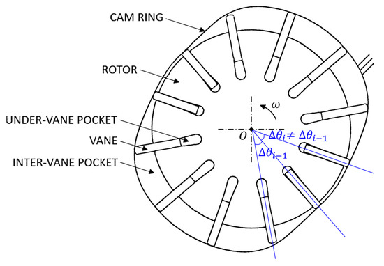 Figure 1 shows the general form of a vane pump. The vanes are inserted into grooves installed radially in the pump rotor and rotate inwardly in the housing. Applying asymmetric pitches to reduce noise in fluid machines with multiple blades is a generally well-established method [5,7]. For the vane pump shown in Figure 1, the spacing between each blade can be arranged asymmetrically as in Equation (1).