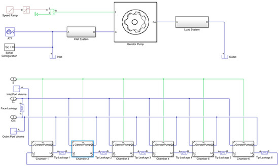 Simulink model of the pump with 6 teeth for analyzing pressure pulsations.