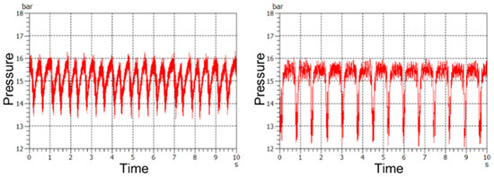 Figure 3 shows the analytical simulation model based on Equation (3), which is formulated based on the geometry of one pump with six teeth. After the pump geometry is designed, the instantaneous hydraulic pulsation can be analyzed by calculating the instantaneous area of each chamber, , which varies according to the tip clearance, side (face) clearance, and port shape. Figure 4 shows the analytical simulation results of pressure fluctuation for two different types of pump designs. This study does not explore detailed pump design specifications, which are confidential, but emphasizes that the instantaneous shape of hydraulic pulsations appears differently according to the clearance and inlet/outlet port shape, as shown in Figure 4. These hydraulic pulsations mainly affect the noise and vibration during pump operations.