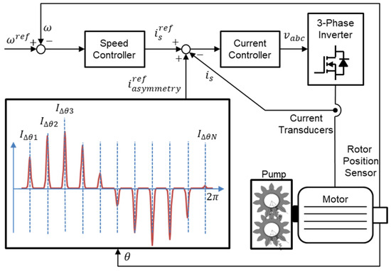 The magnitude of the current reference for the asymmetric pitch control is differentially applied to each tooth sequence, as defined in Equation (4) based on Equation (2), which is known as the asymmetric pitch function in previous studies and patents [5]. Through controlling the motor current, the motor torque is instantaneously controlled according to the number of pump teeth and tooth positions. Then, through instantaneously increasing or decreasing the motor torque according to the symmetric position of each tooth, the same effect as applying an asymmetric pitch can be expected.