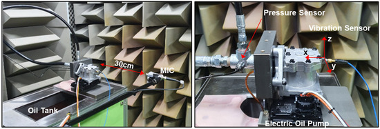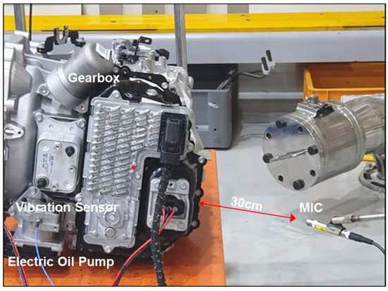 Noise and vibration measurements for the gearbox with the pump under test in the anechoic room. (The gearbox manufacturer: Hyundai Transys, Hwasung, Republic of Korea).