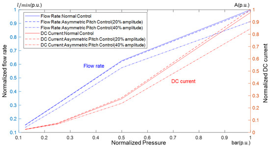 Figure 9 shows the results of comparing the pump hydraulic performance and current consumption according to the application of general control and asymmetric pitch control. It can be seen that when the maximum magnitude of the current reference for the asymmetric pitch control is increased to 40% of the rated current, the flow rate performance is reduced by about 10%. The experiment was conducted by setting the maximum size of the asymmetric pitch control command to less than 20% of the rated current, such that the change in both electric and hydraulic performance was maintained within 1%.