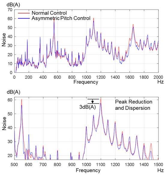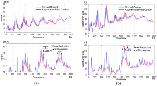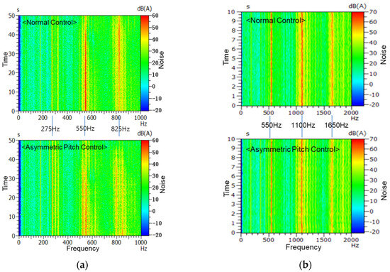 Noise frequency according to the control methods at a 1500 rpm pump operation: (a) normal control; (b) asymmetric pitch control.