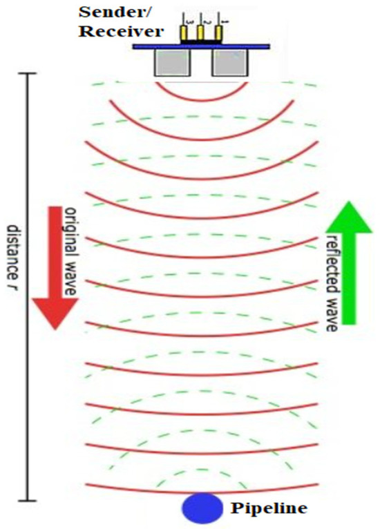 The fundamental principle of this method—based on time-of-flight measurement and reflection of wave energy—has been widely adopted in recent ultrasonic detection research. For instance, ref. [32] developed a positioning algorithm for buried polyethylene pipelines by considering acoustic attenuation properties in heterogeneous soil environments. Similarly, ref. [33] proposed an ultrasonic array tomography approach to accurately reconstruct subsurface images and detect cracks within reinforced concrete structures. Ref. [34] demonstrated that real-time signal processing techniques embedded in ultrasonic visualization frameworks can significantly improve defect localization accuracy. In another study, ref. [35] numerically compared physics-based and machine learning approaches applied to Ground-Penetrating Radar (GPR) data for underground utility network characterization. Their results confirmed the effectiveness of signal interpretation methods, particularly travel time analysis, for determining the depth and geometry of buried infrastructure. These findings are consistent with the operational principles of All Materials Locator (AML) devices and further support their applicability in various geotechnical and infrastructure monitoring contexts. As illustrated in Figure 3, the fundamental principle of this method relies on the time-of-flight of transmitted and reflected waves, a concept similar to that used in ultrasonic detection and widely applied in recent subsurface sensing studies.