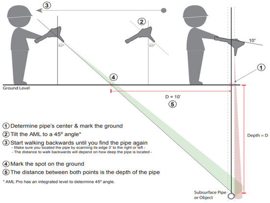 Similar operational considerations for acoustic detection devices have been addressed in recent field-based evaluations, which emphasize the role of user technique and environmental variables in determining measurement accuracy [43]. A representative example of this process is illustrated in Figure 4, which demonstrates a step-by-step method for estimating pipe depth using the AML device at a 45° angle (SubSurface Instruments, 2024 [27]).