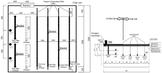 Since 2010, the Sungkyunkwan University Geospatial Technology Center has operated a certified test site dedicated to the evaluation of underground utility detection systems. The facility serves as a standardized environment for validating the depth range, positional accuracy, and detection reliability of various sensing technologies. The 25 m × 25 m testbed is systematically organized into two zones: one comprising metallic conduits and the other composed of non-metallic lines such as PVC and PE pipelines.