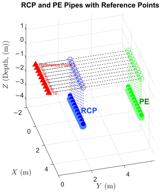 This study focuses on the 3 m deep non-metallic targets. To evaluate detection accuracy, each pipeline was conceptually divided into 10 equal segments along its longitudinal axis. The vertical depth of each corresponding surface point, as well as its horizontal distance from a reference point (placed above ground), was recorded. The geometric layout of the subsurface pipelines and the vertical projection of measurement points onto the surface are visualized in Figure 7. This illustration helps clarify the spatial relationships between the pipelines and the surface reference points used during testing.