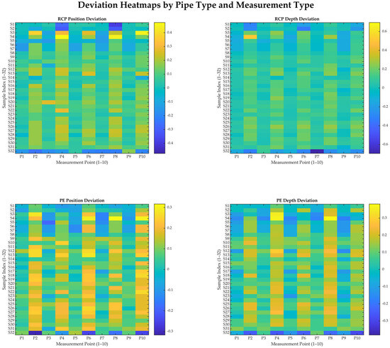 In addition, Figure 8 presents heatmaps of the horizontal and vertical deviations for both RCP and PE pipelines across all 32 samples and 10 measurement points. These visualizations provide a spatial overview of the AML system’s performance, with color gradients centered around zero to emphasize deviation magnitudes and directionality. The consistent color distributions observed in all four heatmaps support the statistical findings and visually confirm the stability, symmetry, and reliability of the AML measurements across different material types and measurement conditions.