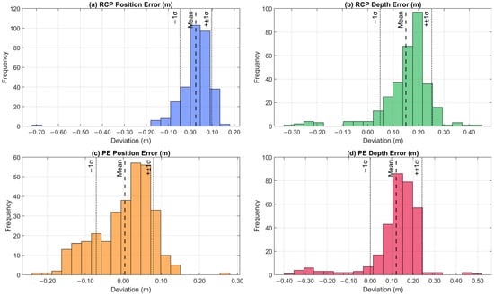 The RCP Position deviation (Figure 9a) exhibited a tight concentration around the mean value of +0.0161 m with a standard deviation of ±0.0584 m, indicating high consistency in horizontal localization. The RCP Depth deviation (Figure 9b) showed a slightly broader distribution with a mean of +0.0822 m and a standard deviation of ±0.1213 m, suggesting slightly greater variability in vertical measurements, which is often influenced by soil compaction and the subsurface conditions.