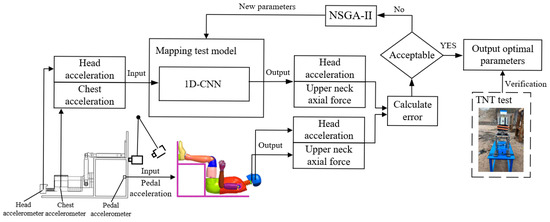 The high-biofidelity dummy used to evaluate occupant protection under blast conditions is often costly and vulnerable. To address the limitations of low-cost, simplified dummy head–neck structures, which exhibit significant differences in mechanical properties compared to high-biofidelity dummies, a virtual–real fusion-based test method for assessing occupant head–neck injury in under-body blast impacts is proposed. A simplified dummy head–neck physical model, designed based on human biomechanical characteristics, is constructed for physical testing. A mapping test model based on 1D convolutional neural network (1D-CNN) is developed as the virtual counterpart to process physical model test data, specifically head and chest centroid accelerations, into head centroid acceleration and upper neck axial compression force matching the Hybrid III 50th numerical model. Pendulum collision tests are conducted to simulate under-body blast impacts, generating multiple sets of head and chest acceleration data. Under identical loading conditions, the head centroid acceleration and upper neck axial compression force of the Hybrid III 50th numerical model are computed. The parameters of the mapping test model are then optimized using these simulated experimental datasets based on non-dominated sorting genetic algorithm II (NSGA-II). Validation through blast experiments demonstrates that the proposed method achieves high accuracy, with errors of 10.9% for the Head Injury Criterion (HIC15) and 2.4% for upper neck maximum axial compression force compared to the Hybrid III 50th numerical model calculations. This approach effectively bridges the gap between biofidelity and cost-efficiency in dummy testing for blast impact scenarios.