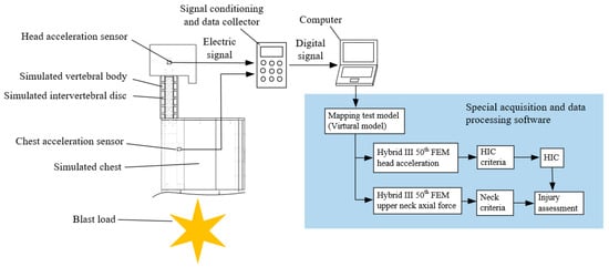 In the practical application of this system. The composition of the test system is shown in Figure 2. The system includes a simple dummy (built-in head–neck physical model), accelerometers, signal conditioning and data collector, and special data acquisition and processing software. The software integrates a virtual model- head–neck injury mapping test model. When the explosion occurs, it will impact the dummy, resulting in a violent movement of the chest and head. The acceleration sensors installed at the centroids of the chest and head record the acceleration signals. These acceleration signals are transmitted through the signal line to the signal conditioning and data collector, and converted into digital signals. Then they are passed to the special data acquisition and processing software. Through the mapping test model in the software, the measured chest and head acceleration signals are mapped to high biofidelity dummy head–neck response, which is the head acceleration and upper neck axial compression force of Hybrid III 50th FEM. Finally, the injury results were evaluated according to the HIC criterion and the neck injury criterion.