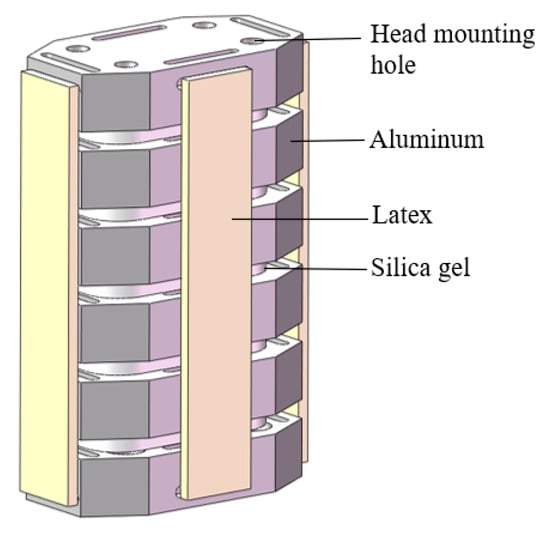 The structure of the human head–neck is complex, comprising cervical vertebrae, muscle groups, blood vessels, lymphatic tissues, and other anatomical constituents. It is considerably difficult to fully replicate the structure of the head–neck. The head–neck structure of a simple dummy should have the ability to recognize damage while having a relatively simple structure. The component primarily responsible for head–neck movement is taken into consideration. The cervical spine, serving as the principal load-bearing structure of the neck, is composed of seven cervical vertebrae, six intervertebral discs, and ligaments [31]. The intervertebral discs separate the vertebrae and possess a high degree of compressibility, which endows the cervical spine with flexibility. In addition, the intervertebral discs function as a damping mechanism.