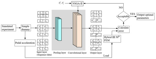 As shown in Figure 7, multiple sets of simulated impact tests were conducted on the simple dummy to test the acceleration signals of the simple dummy’s chest and head, which were used as inputs of the 1D-CNN model. The measured load signal is taken as the finite element model boundary condition, and the head acceleration and upper neck force of Hybrid III 50th FEM are calculated. Optimize the 1D-CNN model filter and bias until the model output responds to match the Hybrid III 50th FEM. To reduce the number of optimization parameters, a pooling layer is set after the input layer, and the data after maximum pooling participates in the convolution operation. (For pooling formula, see (12), and for convolution formula, see (13).) Then, the error of the output layer with Hybrid III 50th FEM under the same loading is calculated. When the error is within the acceptable range, the optimal parameters are output. Otherwise, the NAGA-II generates a new parameter sample of the convolution layer: