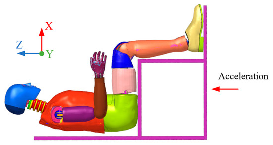 To obtain more data for model training, a simulated experiment was designed, as shown in Figure 9. Considering that the occupant is damaged by the impact for a short time, the experiment simulates the under-body blast impact on the dummy through the pendulum collision on the pedal. The pendulum was raised to a certain height and released, and it obtained certain kinetic energy during the falling process and then collided with the pedal. The lead rail ensures the holistic motion of the dummy. By adjusting the height of the pendulum, various amplitudes of impact can be obtained. By replacing the waveform-generating material of the pendulum and changing the thickness of the material, the time-to-velocity peak can be regulated. Besides, the measurement range of the sensors is 2000 g. The sampling rate of the data acquisition unit is 100 kHz. Data were processed by CFC1000, SAE J211 [41]. The acceleration of the pedal tested by the sensor was loaded to the pedal of the finite element model, as shown in Figure 10. The responses of the Hybrid III 50th numerical model were calculated as optimization targets.