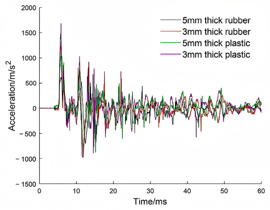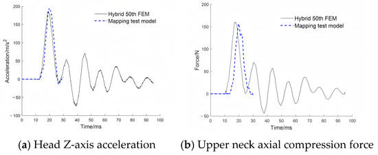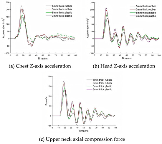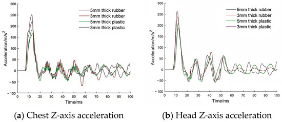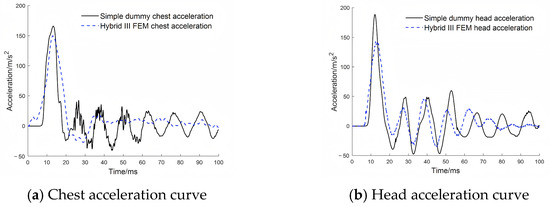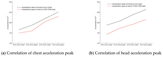 Figure 16 compares the responses of the simplified dummy and the Hybrid III FEM under the condition of 5 mm thick rubber. Although there is a difference in peak values, the waveform profiles are similar in the main peak region upon observation. To verify the ability of the simplified dummy head–neck mock-up to identify response variation, the correlation between the acceleration peak of the simplified dummy chest and head and those of the Hybrid III 50th FEM was calculated.