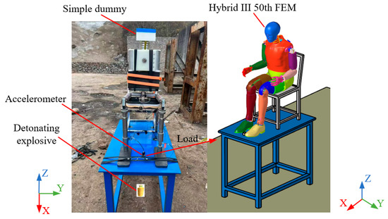 To enhance engineers’ analysis of occupant biological response through force distribution visualization and reduce cost, a finite element model of a dummy has been introduced. LSTC and the University of Washington have jointly developed the Hybrid III finite element model (FEM). Scholars optimized the material properties of the Hybrid III numerical model under high-speed impact conditions by taking into account the strain rate effects. Lou validated the mechanical behavior of the lumbar spine by introducing a stiffer viscoelastic material card [14]. Zhu validated the material properties of the pelvis flesh, lower leg flesh, heel foam, and lower leg skin under the high rate [15]. Then, Suhaimi conducted high-speed impact tests to validate that the computational results of the optimized Hybrid III 50th FEM are in good agreement with the test results of the physical model [16,17] (The correlation and analysis score ranged from 0.653 to 0.901, and the differences in peak response ranged from 1.5% to 12.7%). In terms of applications, Sławiński [18], Suhaimi [19], and Wang [20] used Hybrid III 50th FEM to analyze the human damage under blast. Roberts studied the effect of shock waves on the human head–neck based on Hybrid III 50th FEM [21]. However, the coupling situations between the occupant and the vehicle are complex and varied. Ensuring that the transmission of explosion impacts within vehicles matches actual conditions is extremely difficult in the finite element model. The proposal of the new method can simplify these analyses. In the paper, the finite element model was utilized under simplified conditions to conduct a comparative validation of the new method.