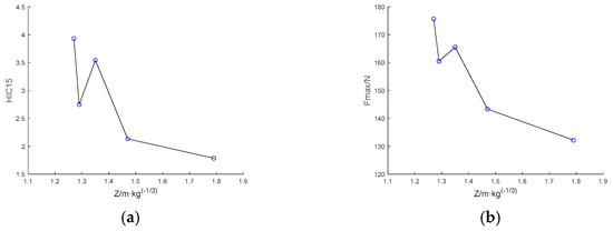 Correlation between injury metrics and scaled distances. (a) Correlation between HIC and scaled distance. (b) Correlation between maximum axial compressive force of the upper neck and scaled distance.