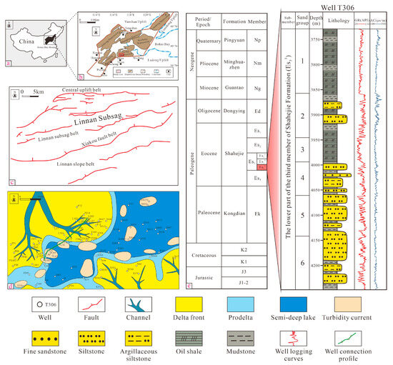 The Linnan Subsag is located between the Linshang Fault and the Xiakou Fault in the southwest of the Huimin Sag, a secondary tectonic unit of the Jiyang Depression in the Bohai Bay Basin of China [39], which is a semigraben subsag with an axial northeast–east direction, north fault, and south overlap with an area of 3000 km2 [40] (Figure 1a,b). The Linnan Subsag includes four structural units, which are the central uplift belt, Linnan Subsag belt, Xiakou fault belt, and Linnan slope belt, from north to south (Figure 1c). The main study area of this paper is the northern source region of the Linnan Subsag, which is located mainly between the central uplift belt and the Linnan Subsag belt. The sedimentary facies of the study area include the delta front, prodelta, semideep lake, and turbidity current subfacies (Figure 1d). Historically, the Linnan Subsag experienced two sedimentary stages, the Paleogene fault sag period and the Neogene fault-depression period, and the Paleogene strata of the Shahejie Formation (Es) and Dongying Formation (Ed), Neogene strata of the Guantao Formation (Ng) and Minghuazhen Formation (Nm), and Quaternary (Q) strata were deposited (Figure 1e). The third member of the Shahejie Formation is the most important exploration horizon at present, and Es33 is the main oil-bearing layer of tight oil in the Linnan Subsag. Under the influence of the Linshang fault activity, the Linnan Subsag produced a steep slope in the late sedimentary stage of Es33, which provided sufficient conditions for the collapse of the delta front and finally led to the development of many deep-water turbidity fan deposits [41]. There are 1–6 sets of sand groups from top to bottom, of which the 1st and 3rd sand groups are source rocks with organic-rich mudstone, whereas the 2nd and 4–6th sand groups are tight sandstone reservoir groups.