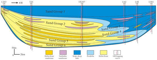 There are two sets of sedimentary systems in Es33 in Linnan Subsag, which are the gravity flow sedimentary system corresponding to sand Group 2 of the deep-water slip turbidity sand body and the delta sedimentary system corresponding to sand Groups 4–6 of the delta front subfacies (Figure 2). Among them, the gravity flow sedimentary system developed turbidity current sedimentation, which has typical identification markers with normal bedding, bottom scouring surfaces, groove forms, thin interbedded sand-mud layers, and incomplete Bauma sequences. The delta sedimentary system in the study area has developed delta front subfacies sedimentation, and the lithology is mainly sandstone, siltstone, and claystone. In addition, the corresponding identification signs are sedimentary structures such as wavy bedding and cross-bedding. Moreover, the logging curve presents a funnel-bell composite shape [42,43].