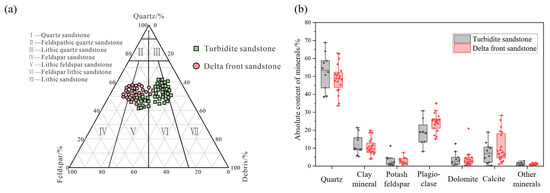 Petrological characteristic of reservoirs: (a) Triangular plot of sandstone classification; (b) Box plot of diffraction analysis results of whole rock minerals.