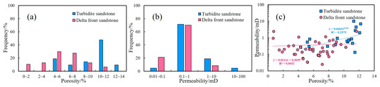 Physical properties of different sedimentary reservoirs for 68 samples: (a) Porosity distribution; (b) Permeability distribution; (c) Correlation between porosity and permeability.