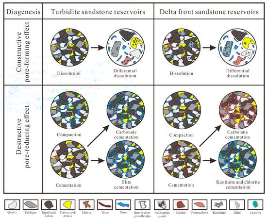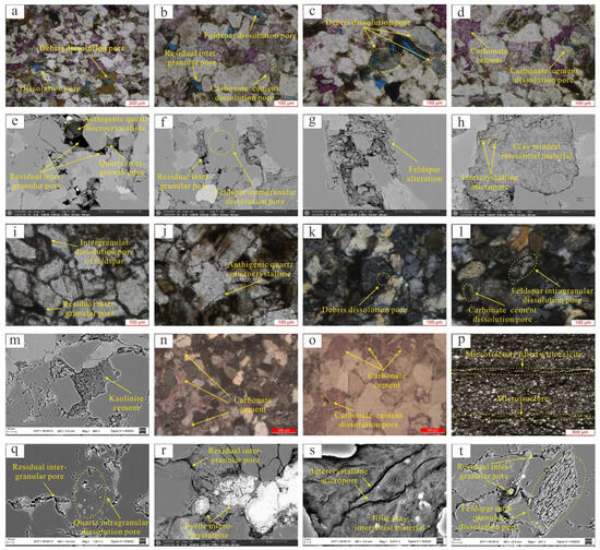 Based on the comprehensive observations and analysis of thin section and SEM images of 17 tight sandstone cores from the different sedimentary facies of the turbidity current and delta front in the Linnan Subsag, there are five main pore types in the study area: intergranular residual pores, intergranular dissolution pores, intragranular dissolution pores, intergranular micropores, and microfractures (Figure 5a–t). Among them, the intergranular pores are composed of residual intergranular pores and intergranular dissolution pores, with the largest proportion of pores. There are few primary residual intergranular pores (Figure 5b), which are mainly intergranular dissolution pores. They are specifically manifested as feldspar particles, quartz particles, debris, and carbonate cementation dissolution pores (Figure 5a,b,d). The second largest proportion of pores are intragranular dissolution pores, which are composed mainly of feldspar and debris dissolution pores in the study area (Figure 5c,f). However, quartz intragranular dissolution pores are occasionally found in the tight reservoirs of the delta front sedimentary system (Figure 5q). Feldspar particles are the main component of both intergranular and intragranular dissolution. Intergranular micropores are mainly intergranular micropores of clay minerals (Figure 5h,s). In addition, diagenetic shrinkage microfractures have developed in argillaceous layers in tight sandstones (Figure 5p).