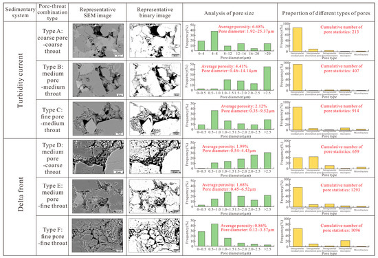 Pore–throat combination types, pore size analysis, and pore type proportion in different sedimentary systems in Es33 in Linnan Subsag.