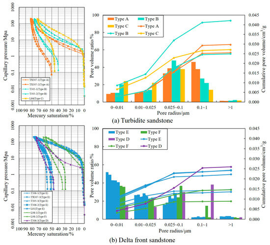 Turbidite sandstone reservoirs mainly feature fine–medium pores (0.025–1 μm), with a pore size distribution that is unimodal. The main peak almost exclusively corresponds to fine pores 0.025–0.1 μm in size, with a main peak occurring in the 0.1–1 μm medium pores. The cumulative pore volume of the turbidite sandstone samples ranged from 0.025 to 0.042 cm3/g, indicating significant changes in the cumulative pore volume in the Type B mercury injection curves. The delta front sandstone reservoirs have developed mainly micropores–fine pores (0–0.1 μm). The pore size distribution exhibits both unimodal and bimodal characteristics, with significant variations in the main peak pore sizes. Micropores (0–0.025 μm), fine pores (0.025–0.1 μm), and medium pores (0.1–1 μm) are present. The cumulative pore volume of the delta front reservoirs ranges from 0.009 to 0.026 cm3/g. Among them, the Type F mercury injection curves have the smallest cumulative pore volume, whereas the Type D curves have the largest cumulative pore volume. The Type E curves show significant variations in the cumulative pore volume, which are primarily distributed within the ranges of 0.010–0.015 cm3/g and 0.020–0.025 cm3/g. Additionally, both the Type D and F curves feature relatively developed medium pores.