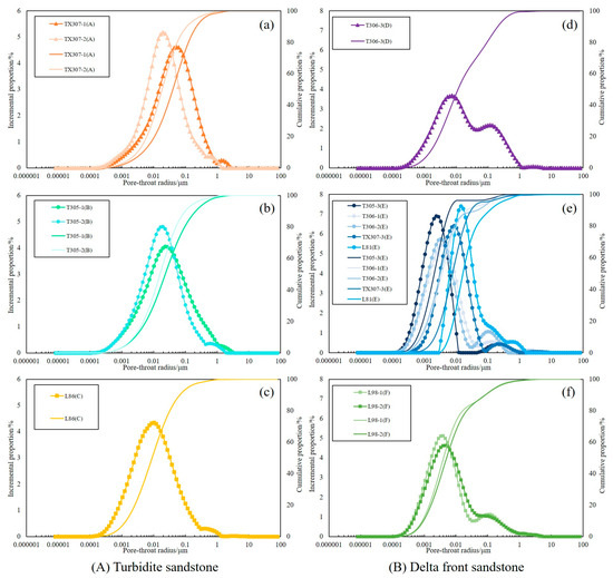 NMR signals can capture information about the pore structure. The figure shows the typical incremental and cumulative distributions of the pore–throat radius in the core plug samples of tight sandstones after saturation with water, corresponding to six types of pore structures (Figure 8). In the NMR pore diameter spectrum in the figure, in addition to the combination of Type D delta front sandstones, which have a distinct bimodal distribution with a main peak at 0.007 μm and a secondary peak at 0.15 μm, the other types exhibit a predominantly unimodal distribution. The pore–throat radii for Type D are distributed between 0.0007 μm and 1 μm. Among the turbidite sandstone samples, Types A, B, and C tend to have decreasing main peak positions in their pore size distributions, ranging from a maximum of 0.04 μm to a minimum of 0.01 μm. For the delta front sandstone samples, Type E has a broader range of main peak variations (0.003–0.015 μm), whereas Type F has significantly smaller peaks, primarily at approximately 0.003 μm. Through spectral comparison and analysis, it is evident that the main peaks of the pore–throat radius in the turbidite sandstone samples are generally larger than those in the delta front samples.