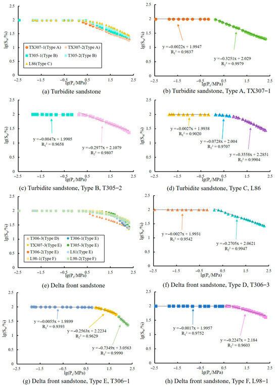 Equation (3) shows that in double logarithmic coordinates, the wetting phase saturation Sw is linearly related to the capillary pressure (Pc). The slope of this line is (D − 3), which allows for the determination of the corresponding fractal dimension. Given that the pore structure of tight sandstone reservoirs exhibits multifractal characteristics [57], first delineating the fractal intervals on the intersection plot is necessary. Within each fractal interval, segmental linear regression can be performed to determine the slope K for each interval. The fractal dimension D can then be calculated based on the slopes obtained from different fractal intervals as follows in Equation (4):