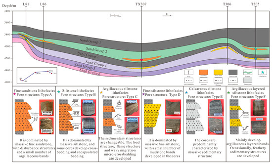 The lithofacies description and spatial distribution characteristics are illustrated in Figure 10. In turbidite sandstone reservoirs, the first type of lithofacies is fine sandstone, which predominantly consists of massive fine sandstone, with some core samples displaying disturbed structures and a small number of mudstone bands. These lithofacies are present mainly at the bottom of the turbidite sandstone reservoirs (sand Group 2), which are in the relatively low-lying area at the center of the subsidence zone within the study area. The second type are siltstone lithofacies, which primarily consist of massive siltstone, but have a visible development of cross-bedding and encapsulated bedding. These lithofacies are present mainly at the top of the gravity flow sedimentary reservoirs in the eastern part of the study area. The final type of lithofacies in the turbidite sandstones is argillaceous siltstone. It is characterized by variable sedimentary structures and bedding, specifically showing the development of load structures and flame structures, while occasional wavy migration microcrossbedding can also be observed. These lithofacies are distributed primarily in the western area of Linnan Subsag and is located mainly at the bottom of turbidite sedimentary reservoirs. With respect to the three types of lithofacies in the gravity flow reservoirs, the fine sandstone and argillaceous siltstone lithofacies both develop at the bottom of sand Group 2, which is in the central and western areas of the study area. In contrast, the siltstone lithofacies are present at the top of sand Group 2, which is primarily situated in the eastern part of the study area. However, the sedimentary reservoirs of sand Groups 4–6 also developed three types of lithofacies under the control of delta front facies. The coarsest lithology is in the fine-siltstone lithofacies, which are characterized primarily by massive structures with a small number of mudstone bands. The lithofacies are predominantly developed in the eastern part of the study area, which has a high structural position and is located at the top of the delta front sedimentary reservoirs. The calcareous siltstone is the second type of lithofacies within the delta front sedimentary facies; it is also characterized by massive structures and is the only one of calcareous sandstone lithofacies among all types. It has developed at the top of the delta front sandstones in the easternmost part of the study area, with a structural position lower than that of the fine-siltstone lithofacies. The final type is the argillaceous layered siltstone lithofacies, which feature a large number of argillaceous layered bands with occasional feathery sedimentary structures. These lithofacies developed in the western and central areas of the study region, occurring at both the top and middle sections of the delta front sedimentary reservoirs. The three types of lithofacies developed under the control of delta front facies exhibit distinct spatial distribution characteristics. The fine siltstone and calcareous siltstone lithofacies have developed mainly at the top of the sedimentary reservoirs in the eastern part of the study area, whereas the argillaceous layered siltstone lithofacies are in the upper–middle section of the reservoirs in the western part.