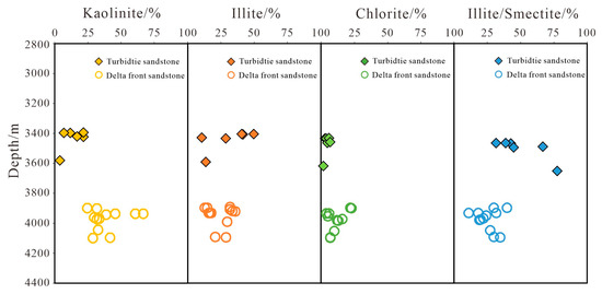 The turbidite reservoirs of Es33 have developed feldspar lithic sandstone and lithic feldspar sandstone, and a small amount of lithic sandstone has also been discovered. However, the delta front reservoirs have developed mainly lithic feldspar sandstone and feldspar sandstone (Figure 3a). The lithic compositions of these two different sets of sedimentary reservoirs are dominated by metamorphic rock cuttings. In addition, in terms of the feldspar content, plagioclase accounts for a significantly greater proportion than potassium feldspar. According to the XRD rock mineral diffraction results, the quartz content is the highest (68.8% in turbidite sandstones, with 62.9% in delta front sandstones), followed by plagioclase and clay minerals (mostly higher than 10%). In delta front sandstones, the quartz and clay mineral contents are slightly lower than that in turbidites, whereas calcite is anomalously enriched, constituting up to 28.2% of the rock (Figure 3b).