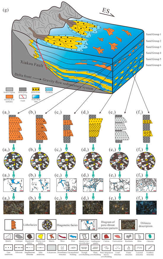 The turbidite sandstones are generally coarse, are predominantly composed of fine sandstone and siltstone, and exhibit distinctive gravity flow sedimentary structures. The delta front reservoirs are primarily composed of fine siltstone and calcareous siltstone. The sedimentary structures are relatively sparse, with some mudstone bands developed. Summarizing the lithofacies classification results, different pore structure types correspond to the following lithofacies, as shown in Figure 10. In turbidite sandstone reservoirs, the Type A pore structure is associated with fine sandstone lithofacies, which predominantly consists of massive fine sandstone, with some cores displaying disturbed structures and minor mudstone bands. The type B pore structure corresponds to siltstone lithofacies, which consists mainly of massive siltstone, but also features cross-bedding and convolute bedding. The type C pore structure is linked to argillaceous siltstone lithofacies, which are characterized by variable sedimentary structures and bedding, with load structures and flame structures developed, and occasional wavy migrating microcross-bedding. Under the influence of the delta front subfacies, the Type D pore structure corresponds to the fine siltstone lithofacies, which predominantly consists of massive structures with minor mudstone bands. The type E pore structure includes a variety of lithofacies, such as calcareous siltstone lithofacies and argillaceous layered siltstone lithofacies. The former is mainly massive, whereas the latter features feathery sedimentary structures. The Type F pore structure is associated with silty mudstone lithofacies and is characterized mainly by massive structures, although some cores contain debris or sandy masses.