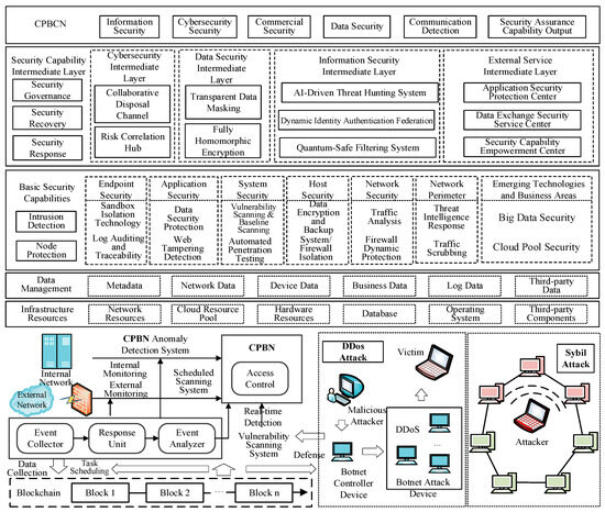 As the tactical execution center, the CPBN anomaly detection system leverages blockchain technology to construct a real-time cyber defense sandbox. The intranet monitoring module anticipates lateral movement risks through traffic fingerprint analysis, while the extranet monitoring unit employs machine learning to model DDoS attack patterns. Upon detection of a Sybil attack, the system rapidly identifies anomalous nodes via consensus algorithms and synchronously activates a collaborative mitigation channel for on-chain isolation. The specially designed threat hunting system transforms security incidents into traceable blockchain data and interacts with the risk correlation hub via smart contracts, thereby realizing a closed-loop defense mechanism from detection to recovery.