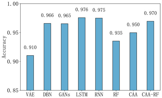 The experiments were all conducted on a personal computer manufactured by Compal Electronics in Nanjing, China and equipped with a 12th-generation Intel i7-12650H processor, 64 GB of RAM, and an NVIDIA RTX 4060 GPU, running Python 3.9. Various attacks, including DDoS attacks and Sybil attacks, were simulated within the network environment, and data under both normal and abnormal network conditions were collected. Accuracy evaluations were carried out using several models, including autoencoder, DBN, GANs, LSTM, RNN, VAE, CAA, and CAA-RF. Based on this dataset, deep learning neural networks were trained, and the accuracy for each training epoch was recorded. For every training round, the accuracy was assessed using the test set. Accuracy reflects the model’s overall predictive ability on all samples and serves as a fundamental metric for assessing the global performance of the model. Through accuracy, we can intuitively understand the proportion of correct classifications on the entire dataset, which facilitates comparative analysis with other methods. However, in anomaly detection tasks with extremely imbalanced data, accuracy can sometimes be dominated by the most normal samples. Therefore, we use it as a reference for overall performance. Moreover, the F1 score, as the harmonic mean of precision and recall, comprehensively measures the model’s ability to identify anomalous samples. In anomaly detection scenarios, relying solely on accuracy may mask the omission of anomalous samples, while the F1 score effectively balances the two types of errors: missing anomalies and misclassifying normal samples as anomalies. Thus, the F1 score can more accurately reflect the model’s actual performance in detecting minority anomalies, which is especially suitable for the class imbalance problem faced in this study.