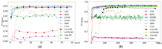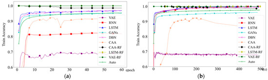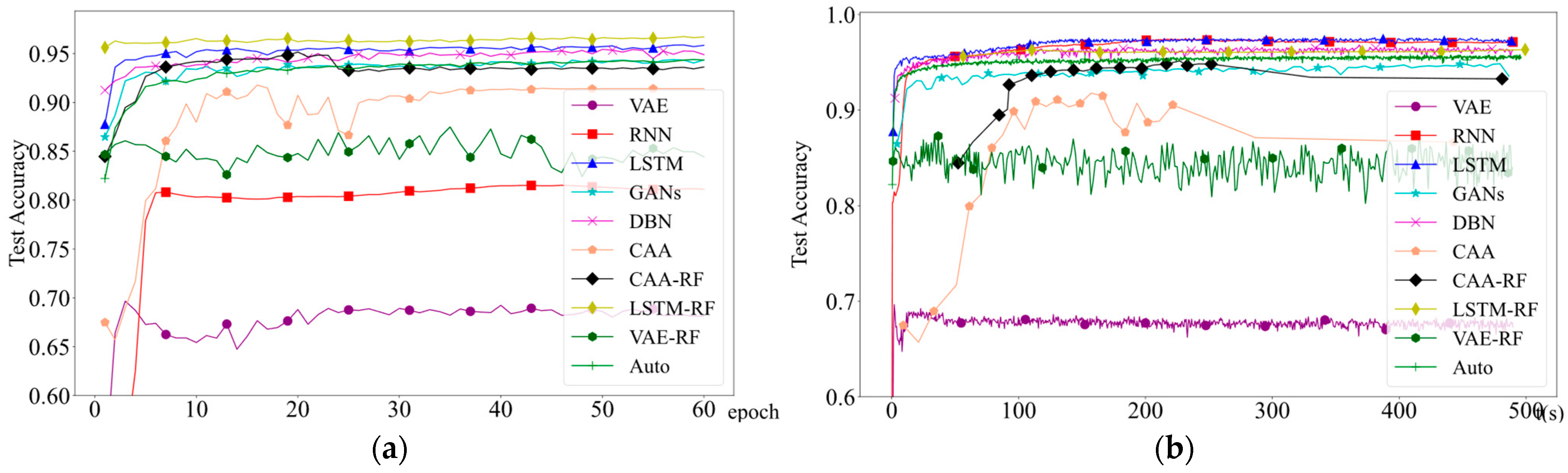 In this experiment, we compared the F1 scores, training accuracy, and testing accuracy of various deep learning models, as shown in Figure 7, Figure 8 and Figure 9. In Figure 7, Figure 8 and Figure 9, subfigure (a) shows the changes in model performance with respect to training epochs, while subfigure (b) shows the changes in model performance over time. The differences between these plots depend on the training duration per epoch for each model, which helps demonstrate the models’ operational efficiency and computational overhead. Within the 500-s time window, the number of epochs included for each model is as follows: VAE: 910; RNN: 981; autoencoder: 146; LSTM: 702; GANs: 98; DBN: 589; CAA: 25; and CAA-RF: 25. As shown in Figure 7b, the first data point for some models does not appear at seconds. This is because the model undergoes initialization and requires a relatively long training time during the first 50 s after training begins, so the first data point is generated several seconds later. As a result, the initial data point of the curve appears at the 50-s mark instead of at seconds. As shown in Figure 7, the F1 score versus training rounds and time (s) curve is illustrated. The horizontal axis represents the number of training iterations and training time (s), while the vertical axis indicates training accuracy. The results reveal that Generative Adversarial Networks (GANs), Long Short-Term Memory (LSTM) Networks, and CAARF consistently demonstrated excellent F1 scores throughout the training process, particularly after a certain number of iterations, where their advantages became more apparent. In contrast, models such as Variational Autoencoders (VAEs) and Recurrent Neural Networks (RNNs) performed less effectively in the early stages but showed significant improvement as training progressed.
