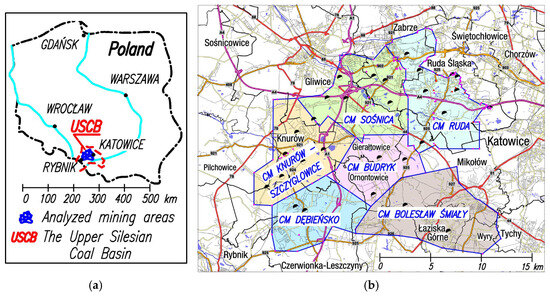 (a) Location of the Upper Silesian Coal Basin. (b) Map of the analyzed mining areas. Own study based on reference [36].