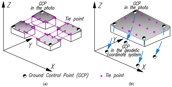 (a) Aerotriangulation block—combining independent models. Own work [23] based on [38]. (b) Aerotriangulation block—transformation into the geodetic system. Own work [23] based on [38].