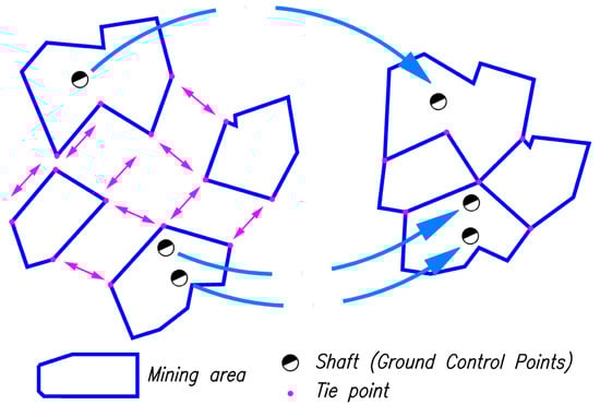 In the presented research, as mentioned above, it was assumed that the tie points in the implementation of the task would be identical boundary points, while the shafts would be the adjustment points (Figure 4).