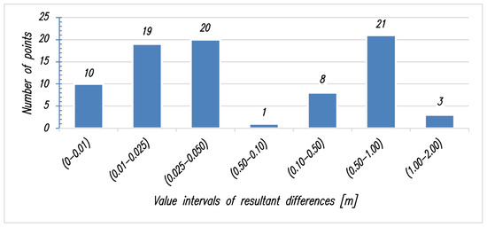 Based on the distribution shown in Figure 6, it was found that, in the case of about 60% of the boundary points, the differences were not greater than 0.05 m, and in the remaining approximately 40% of cases, the differences were within the range from 0.05 m to as much as about 2 m. However, in as many as 32 cases, the differences were above 0.50 m.