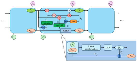 To clearly illustrate the proposed architecture, Figure 2 further details the internal structure of the KARN layers, highlighting their mathematical formulation and computational flow. The KARN is designed specifically to model sequential data, capturing context-sensitive dependencies through an integration of Kolmogorov–Arnold Networks and memory-based recurrence mechanisms. KARN modifies each transformation function within the traditional KAN architecture by embedding a temporal dimension. Formally, the input to each recursive sublayer at time t is expressed by the following relation: